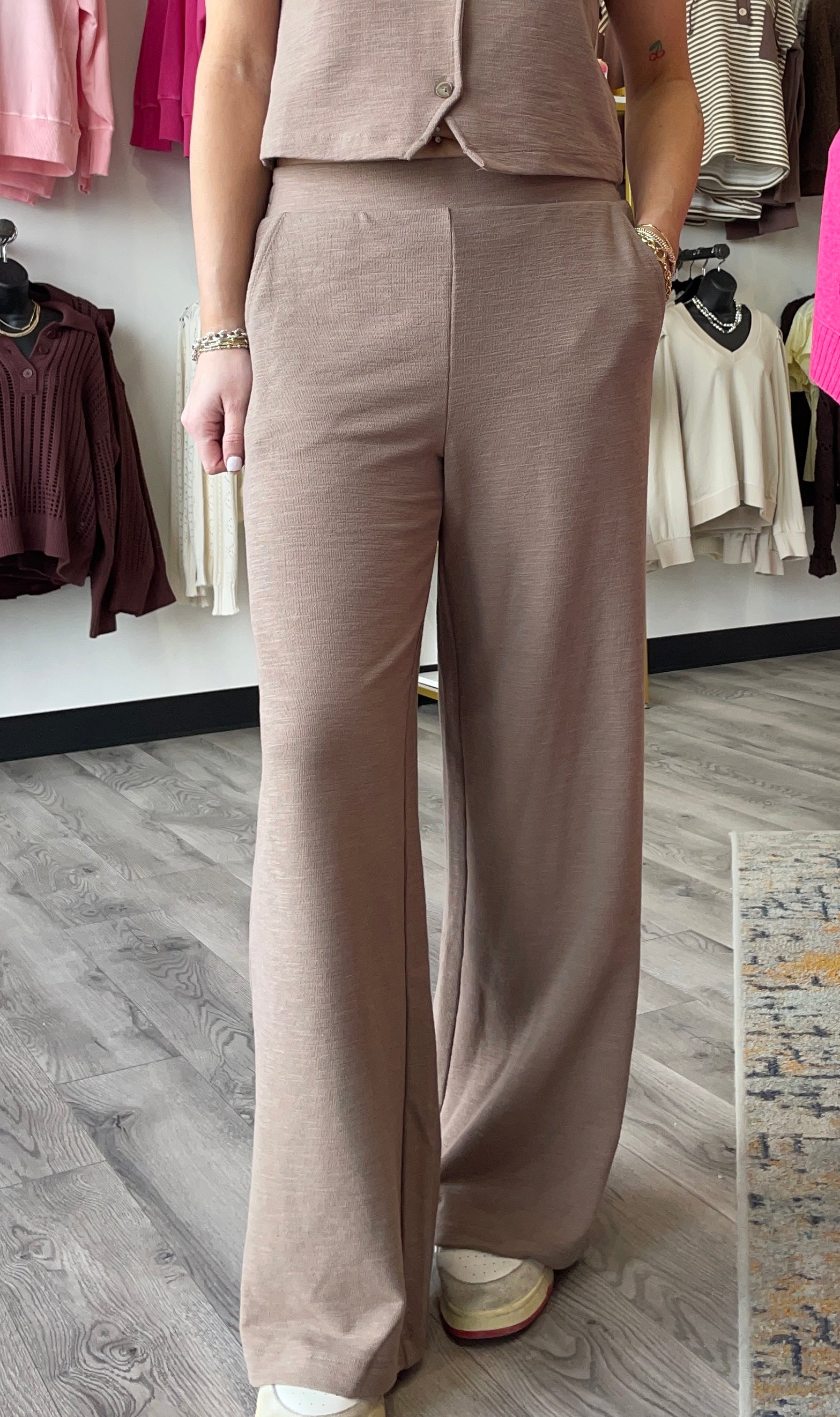 Featuring an elastic waistband, high rise fit, and side pockets, this lightweight pant moves gracefully with you. Complete the look with the Noelle Textured Tank Top.