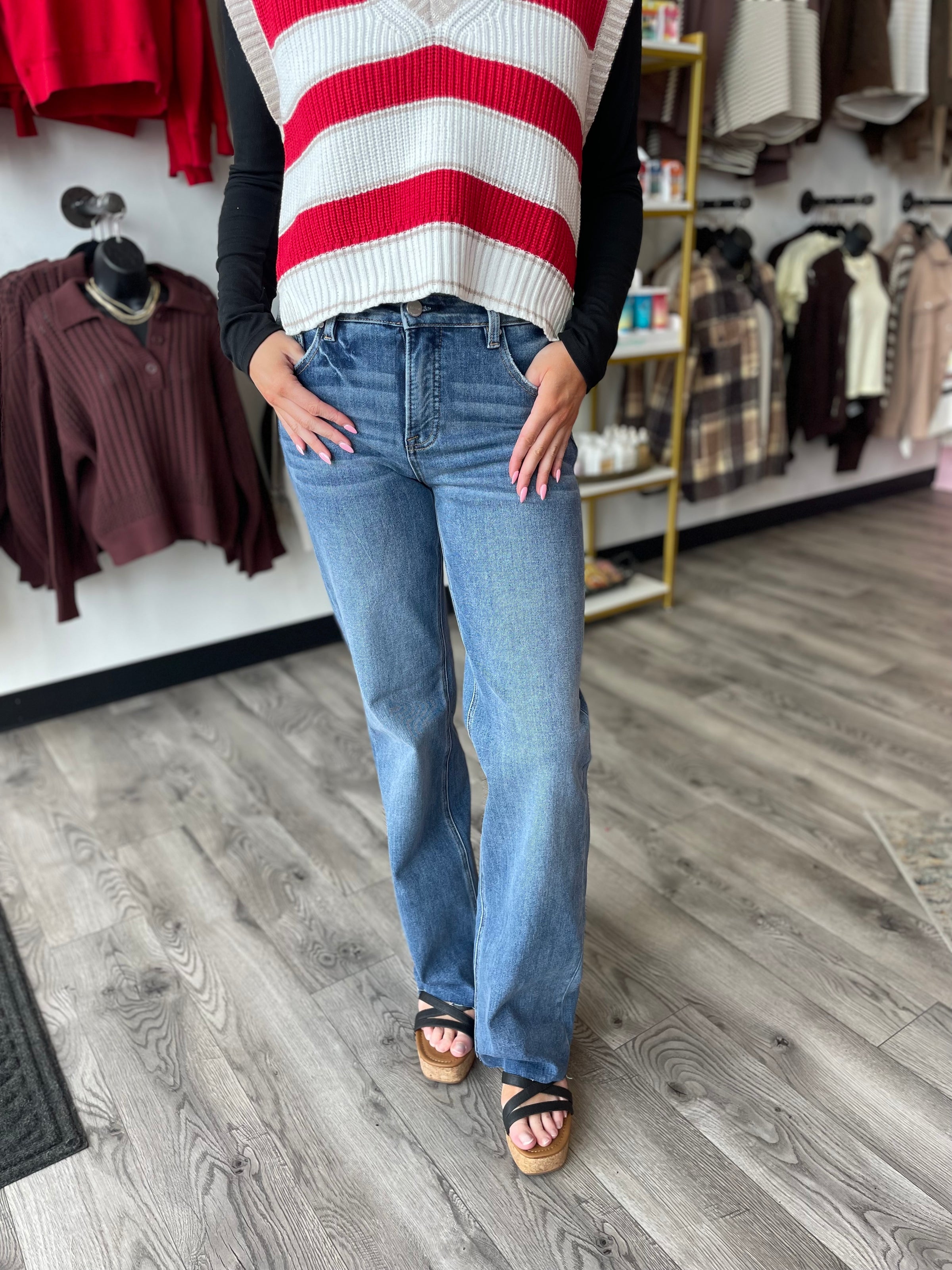 The Taura 4-Way Stretch Mid-Rise Straight Jeans are a new style from Risen. They have Risen's great stretch, but still keep their shape throughout the day. These jeans feature a raw hem, so they can be cut for our shorter girls. They can also be cuffed for a more casual look.