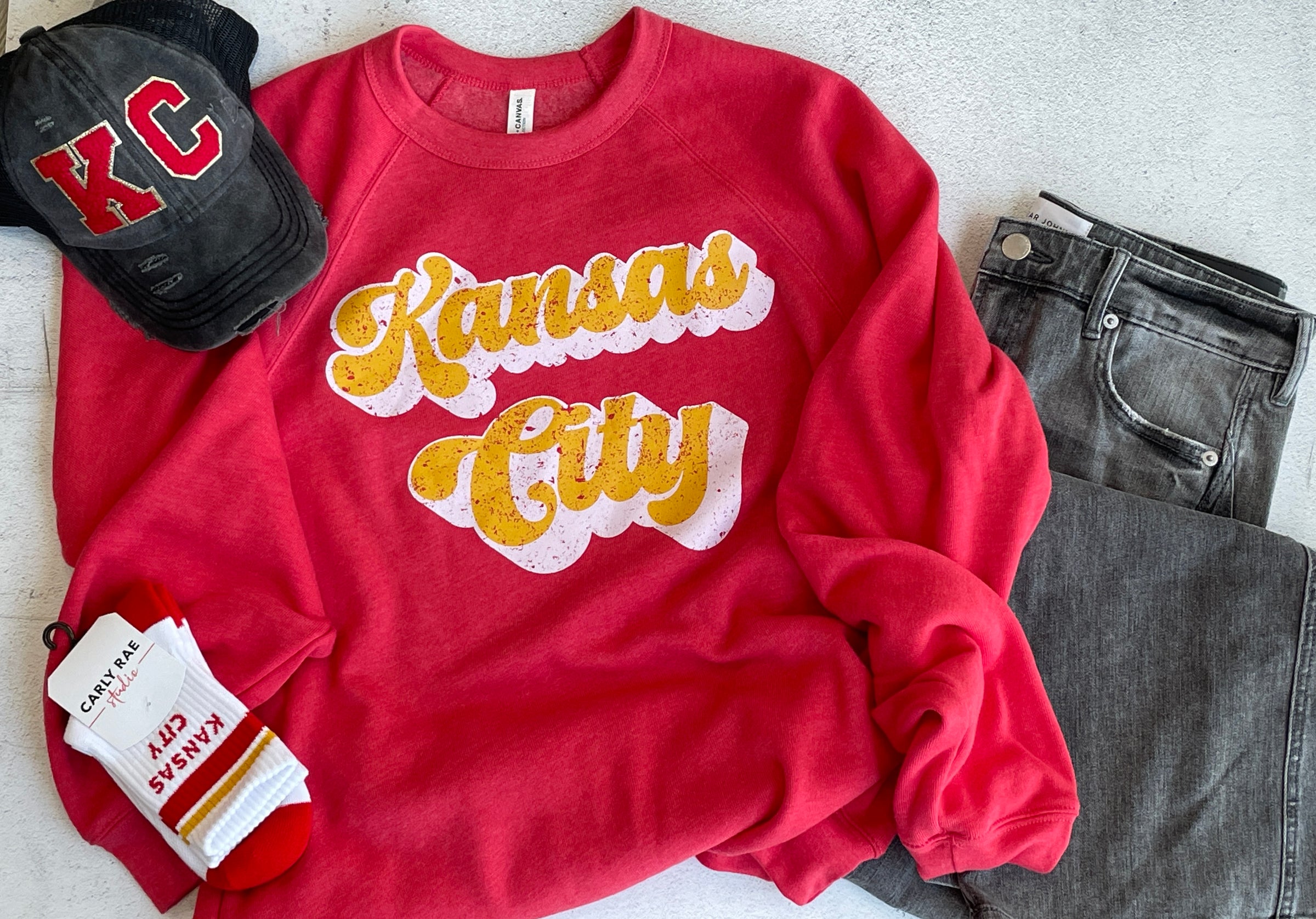 The Groovy Kansas City Sweatshirt is on a cozy Bella Canvas fleece sweatshirt.  Snuggle up on game day with this cute, comfy crewneck.