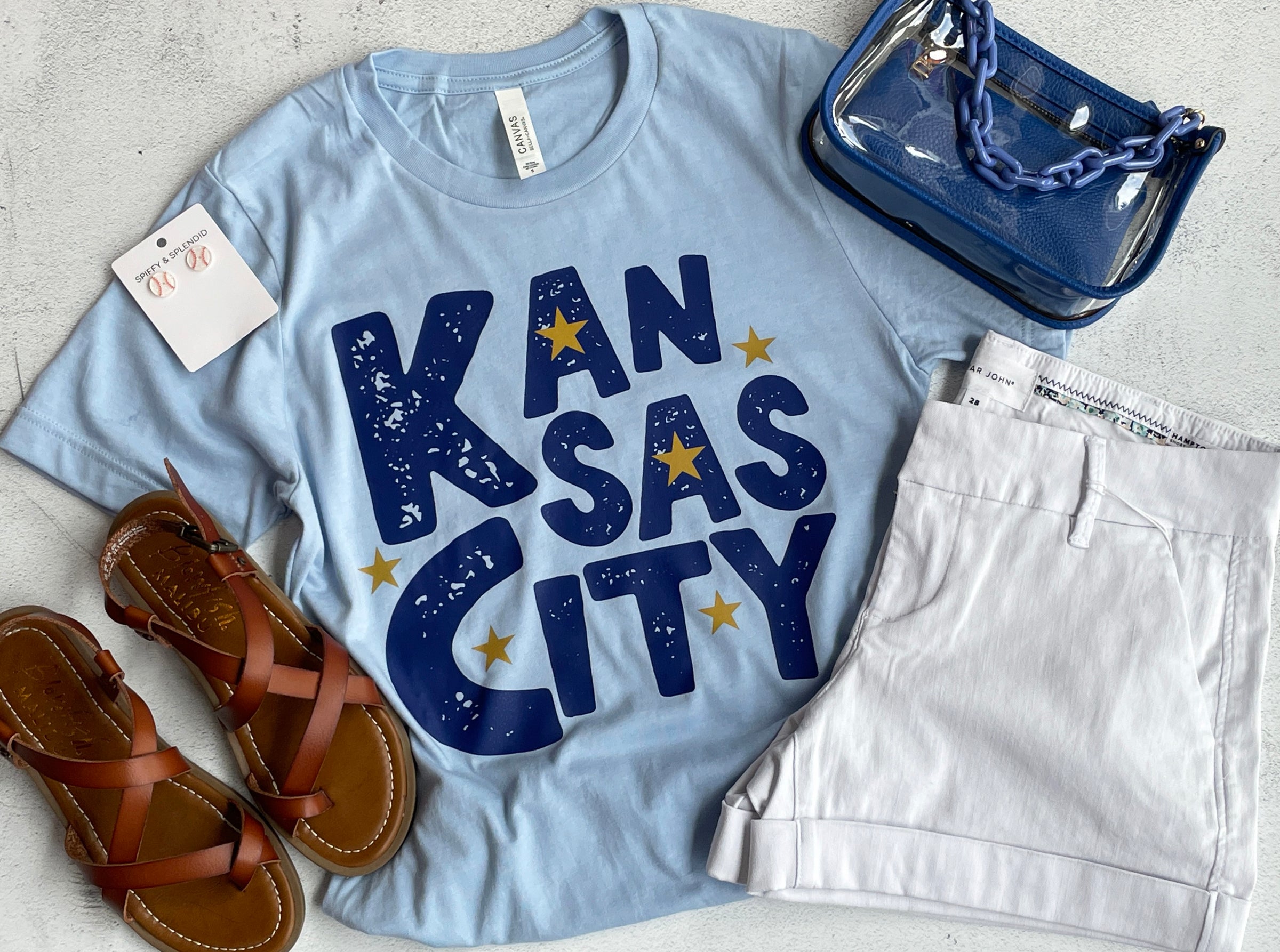 This all-new Kansas City Grunge Tee is fun and festive for baseball season.  DTF printed on a Bella Canvas unisex tee.