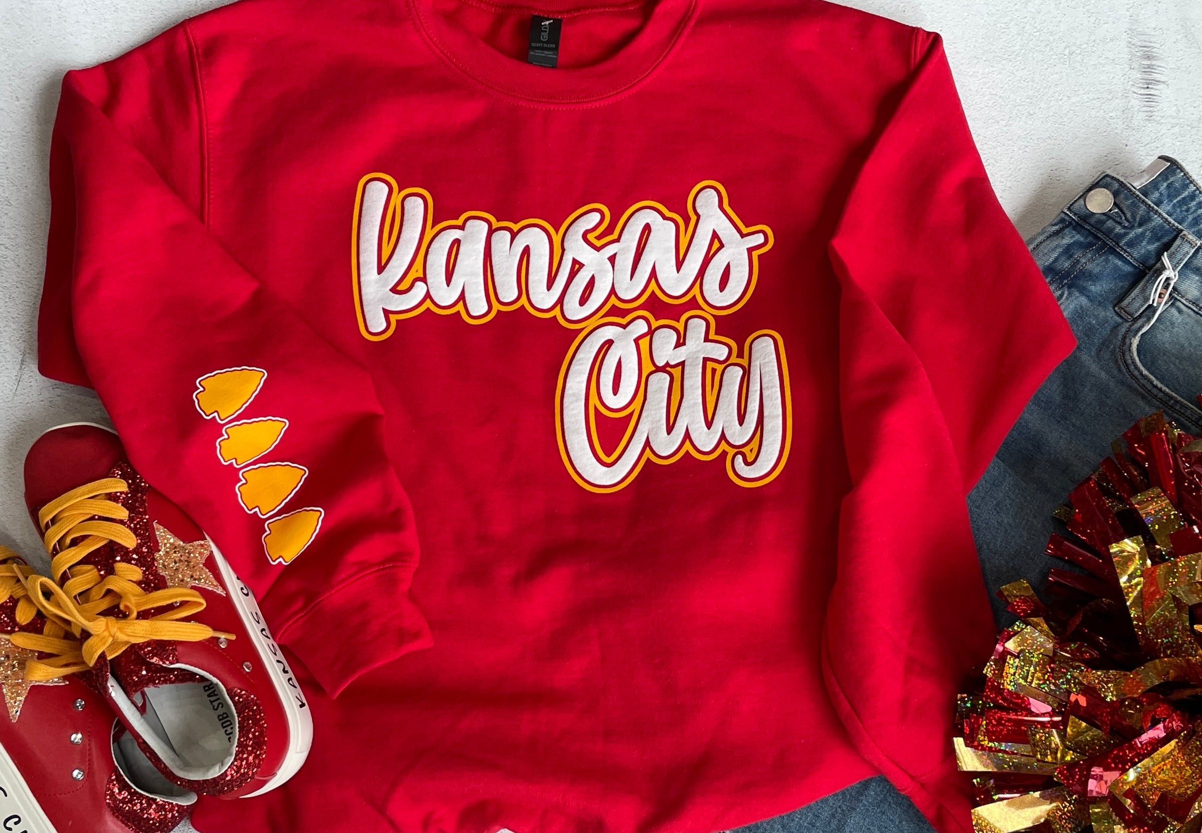 it features Kansas City in puff screen print and arrowheads on the left sleeve.