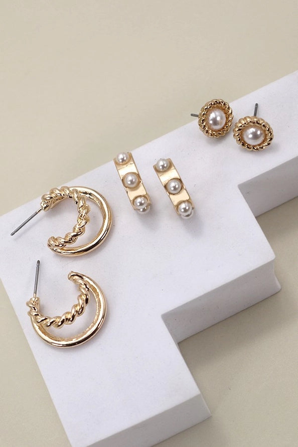 Gold Pearl Hoop Stud Trio Earrings