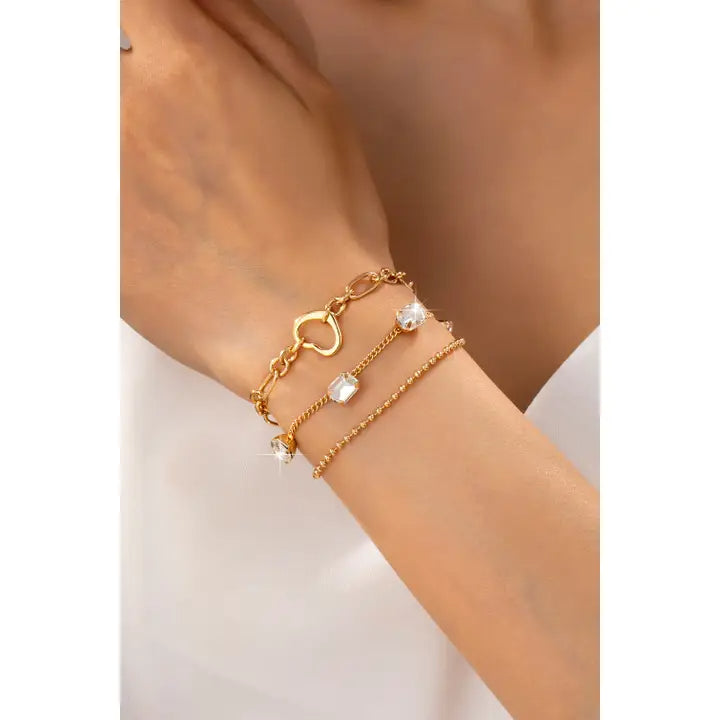 Multi-layer bracelet featuring a striking rectangular stone centerpiece paired with a dainty gold heart charm. Sleek gold-tone chains and subtle accents create a refined, layered look that's lightweight, versatile, and effortlessly blends modern sophistication with romantic charm.