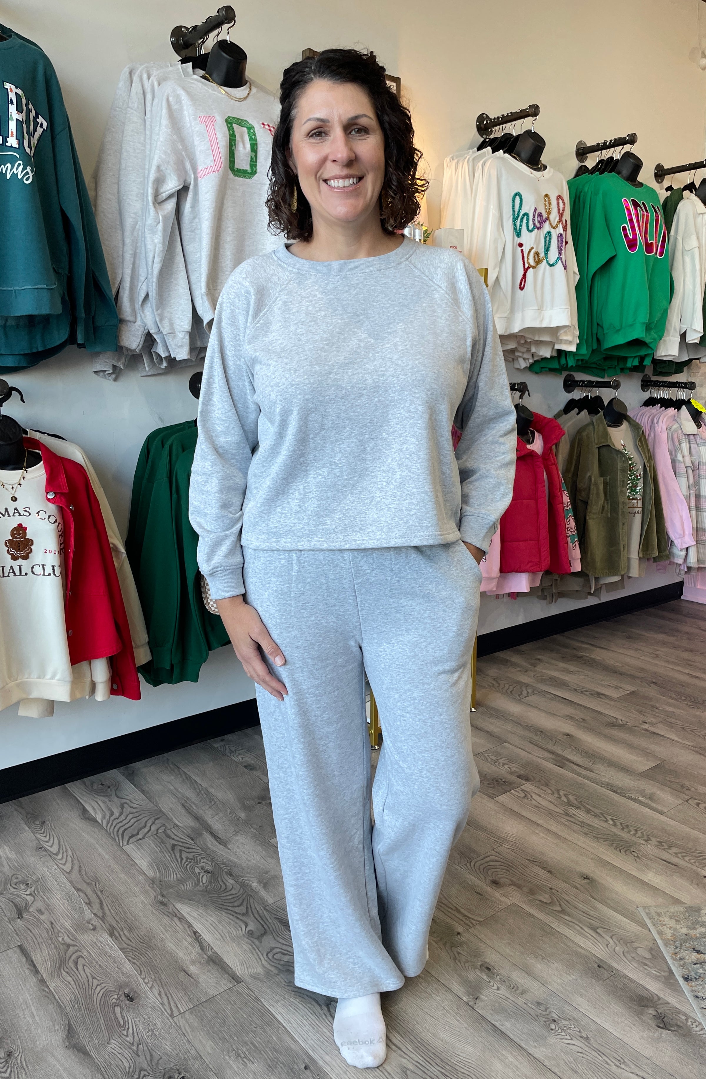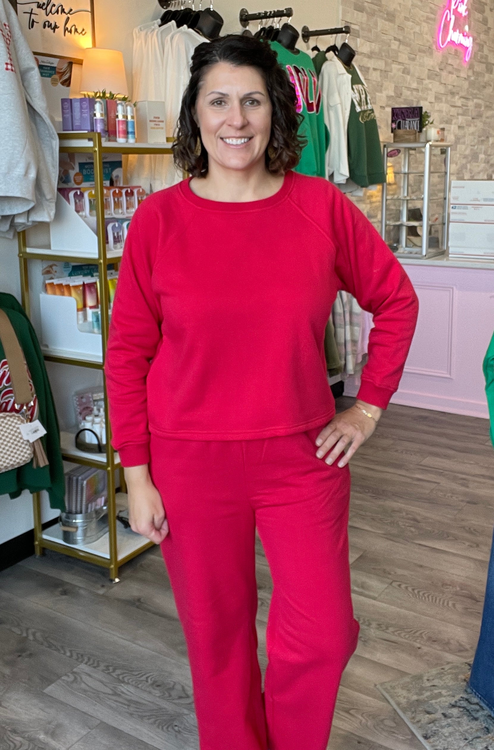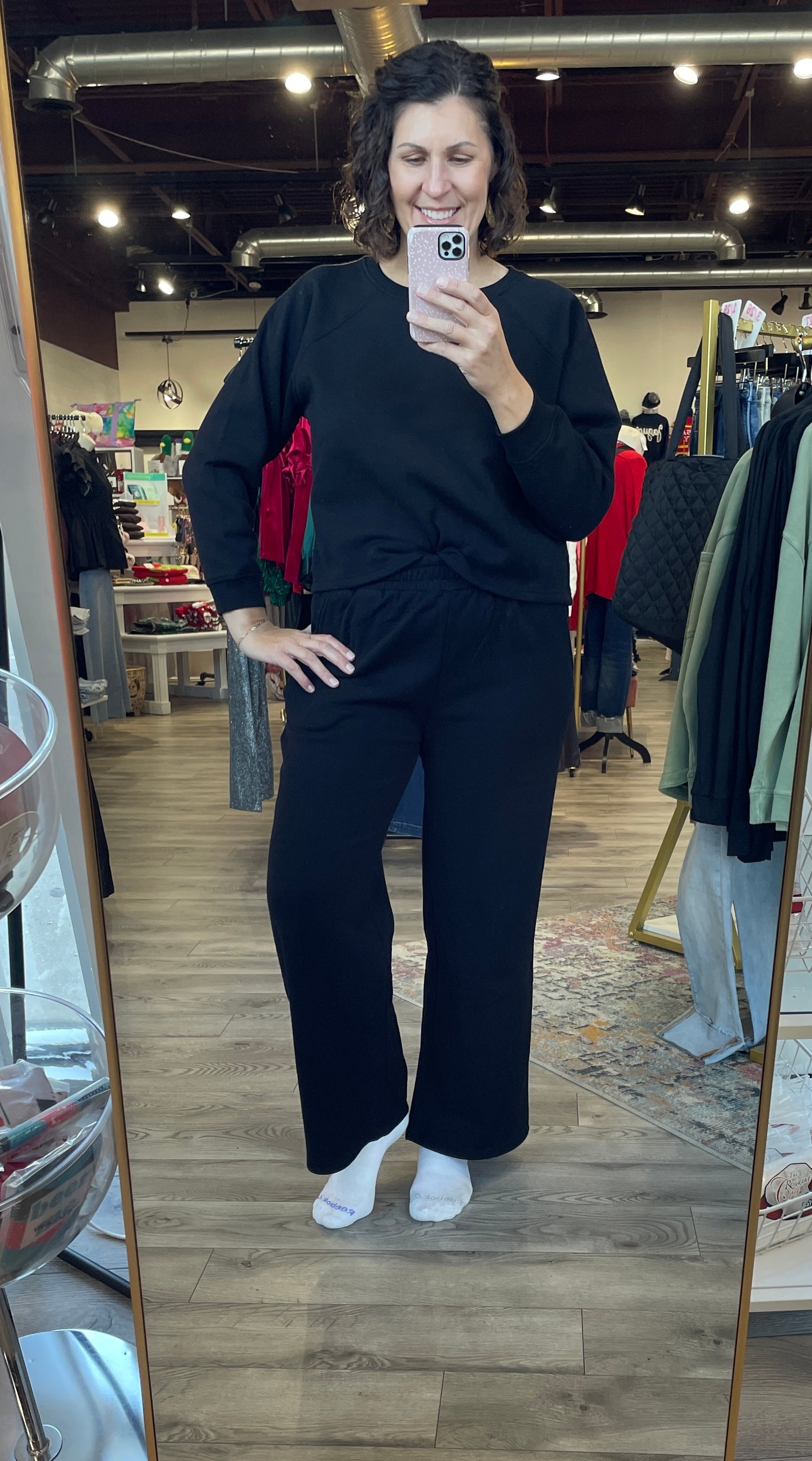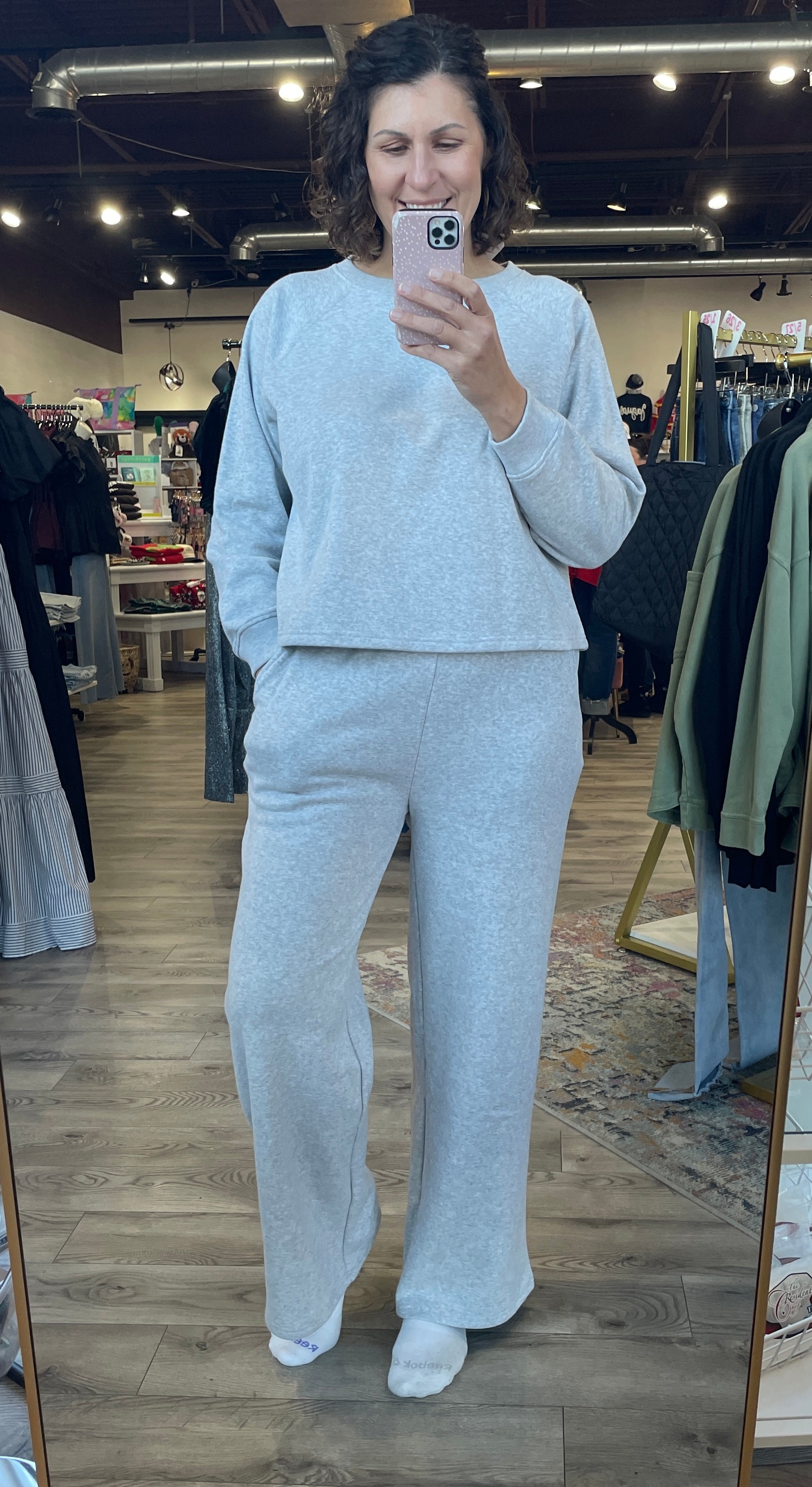 The Victoria Fleece Pullover & Pants Set features a semi-cropped sweatshirt and matching sweatpants, with pockets. It seriously feels like you're wearing a blanket. So cozy!! Great fit and perfect for lounging or being comfy on a day out.