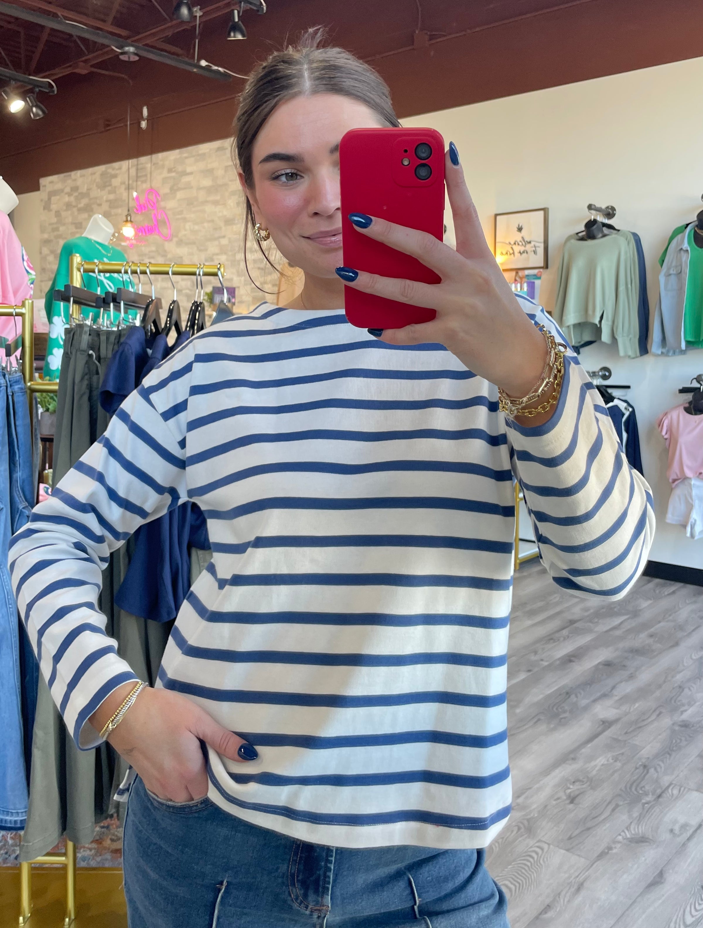 Striped long-sleeve top with a relaxed silhouette and boat neckline. Dropped shoulders create a laid-back look, complemented by a straight hem and soft, smooth texture.