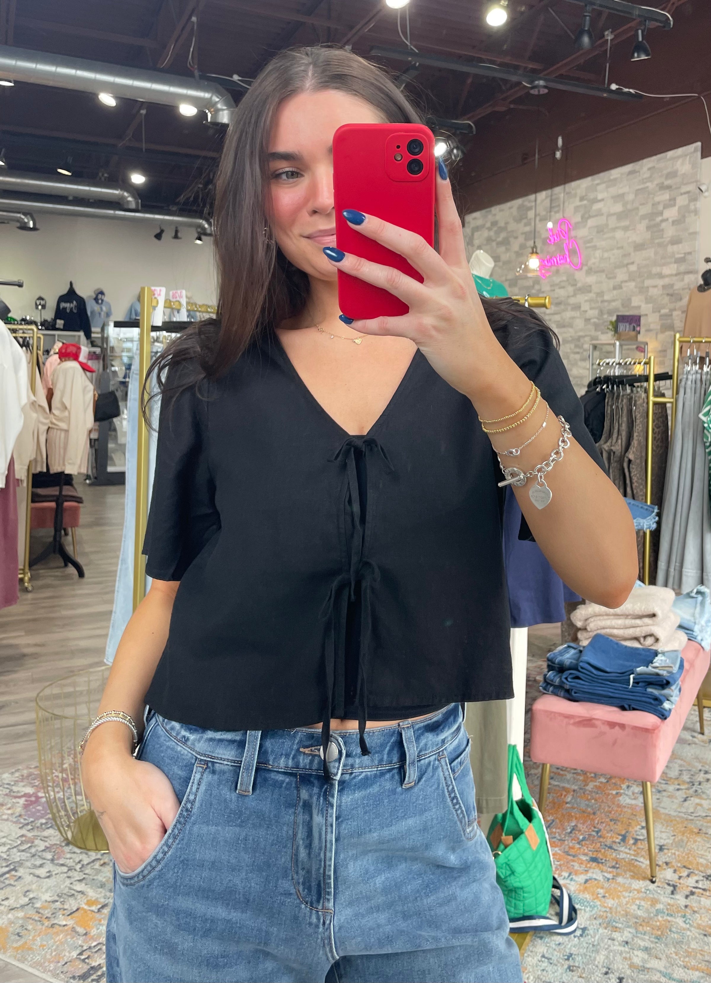 This feminine top is an instant favorite with its washed linen blend fabric, flattering relaxed fit, and tie front, finished with a modesty placket for easy coverage. Made to be dressed up or down, try it with denim or linen pants
