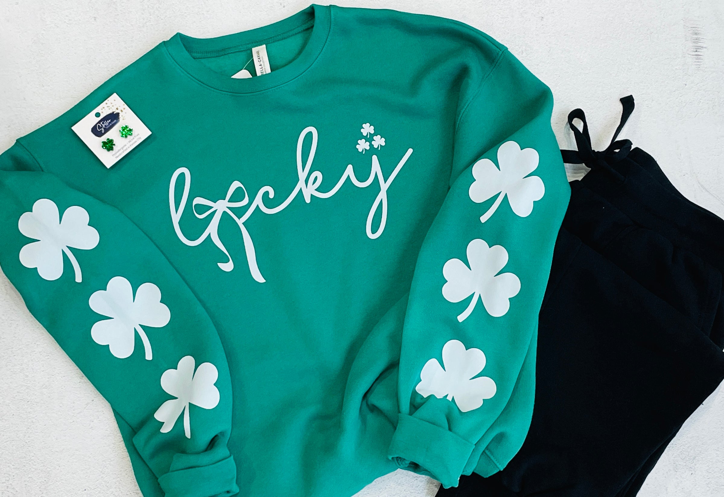 Look adorable this St. Patrick's Day with the Lucky Shamrock Crewneck.  DTF printed on a Bella Canvas sweatshirt, it features shamrocks down both sleeves.