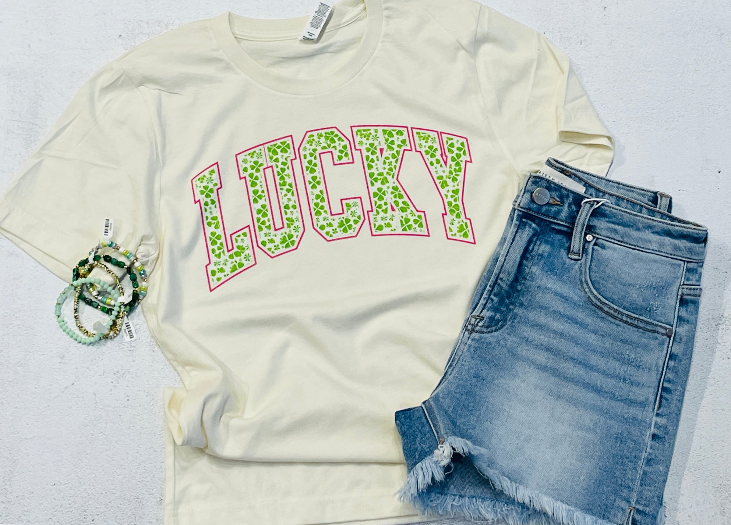 Get your green on with this simple, but cute Lucky Shamrock Tee.  Lucky is outlined in hot pink and filled with shamrocks.  Wear this tee on its own or pair with your favorite jacket, cardigan, or mesh top.
