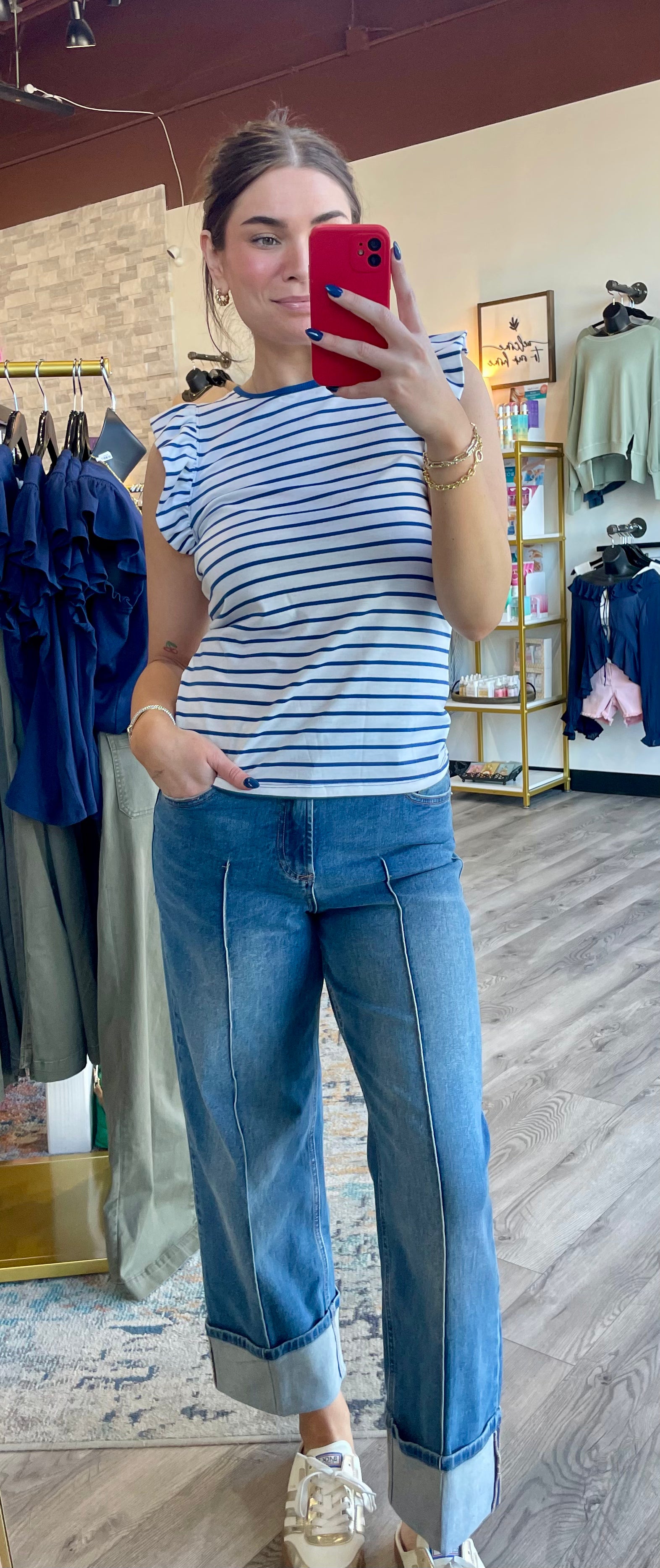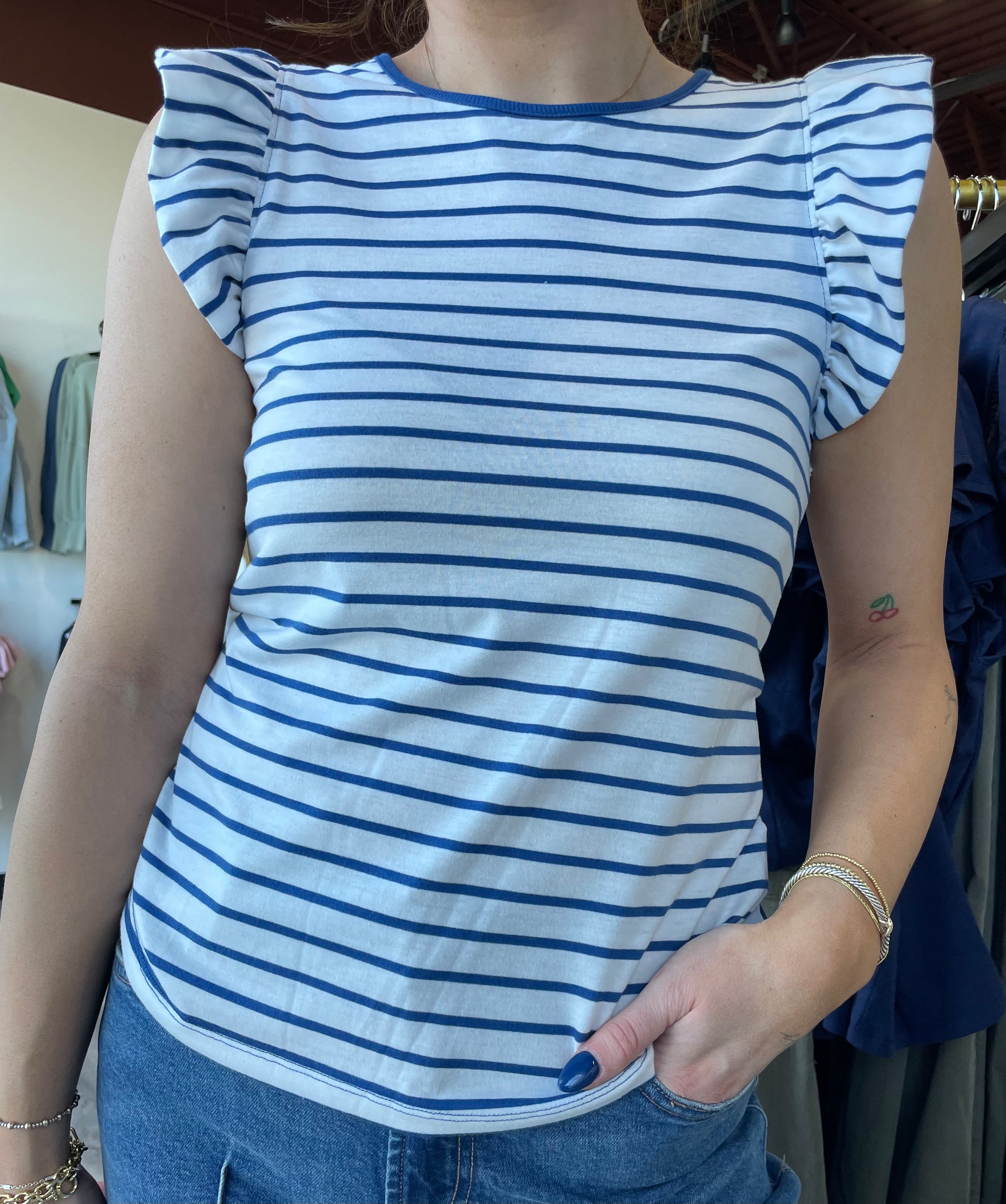 The North Top from Another Love is a ruffle trimmed top in slubby material, and crew neck finished sleeveless.  This is one of our favorite tops for spring and summer.  Lightweight and comfortable.  The ruffle trim adds a little fun to a simple, basic top.