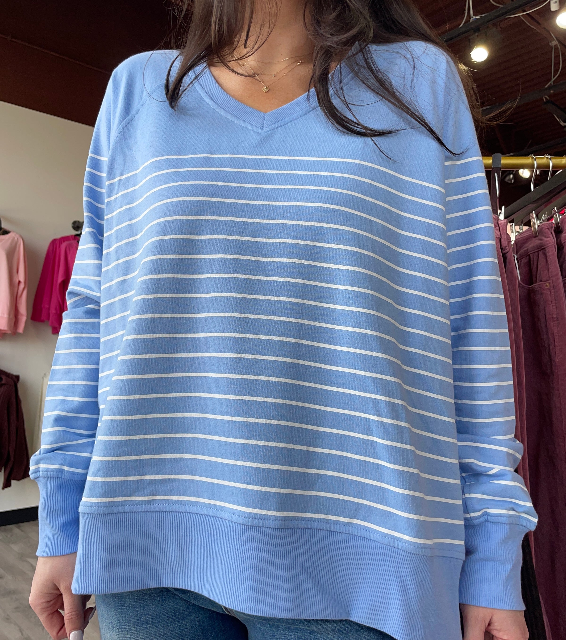 The Weekender Stripe V-Neck from Z Supply in Barcelona Blue offers a relaxed fit with soft stripes and a classic v-neckline. Its lightweight fabric keeps you cool and comfortable, perfect for everyday wear.